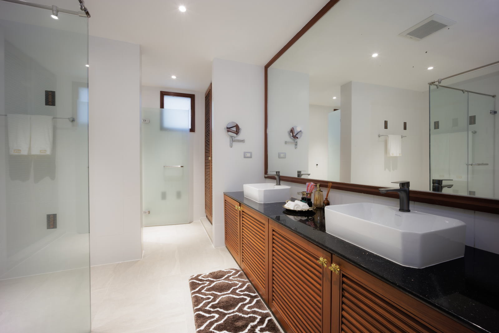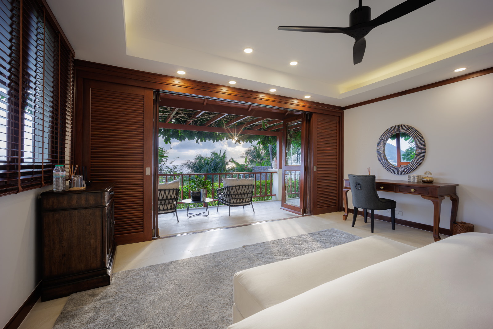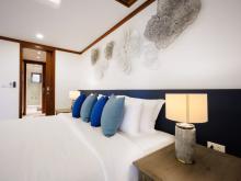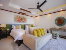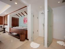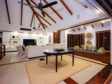 There are several super comfortable lounge areas to accommodate all guests and spacious outdoor spaces for sunbathing, dining and socialising. The ground floor of the villa houses the two master suites with king-size beds and a balcony that leads to the pleasant garden area and lawn. The second master has its own balcony and both suites have spacious bathrooms with whirlpool tubs and separate showers. The third and fourth bedrooms have twin beds that can be changed to king-size each with a private bathroom and shower. The fifth air-conditioned bedroom has a single bed and bathroom used as a maid’s room or guest bedroom.