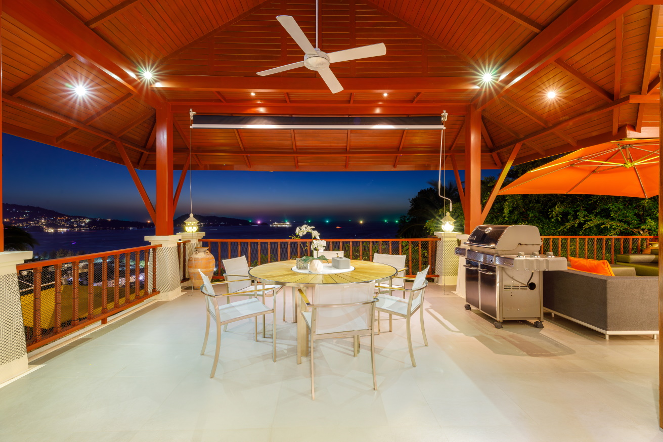The stylish upper floor with open living spaces and an extensive balcony blends Asian décor with contemporary furnishings creating a relaxing and luxurious ambiance. Guests have a choice of dining in the air-conditioned interiors or al fresco on the front terrace. There is also a shady pavilion to the side of the property featuring a relaxing daybed next to a bar.